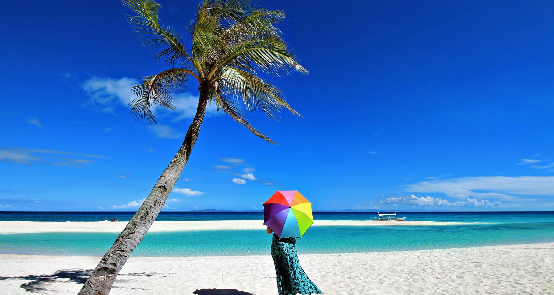 サンタフェの快適ビジョンは、青い海、白い砂、椰子の静穏な島に吹き抜ける涼しい浜風